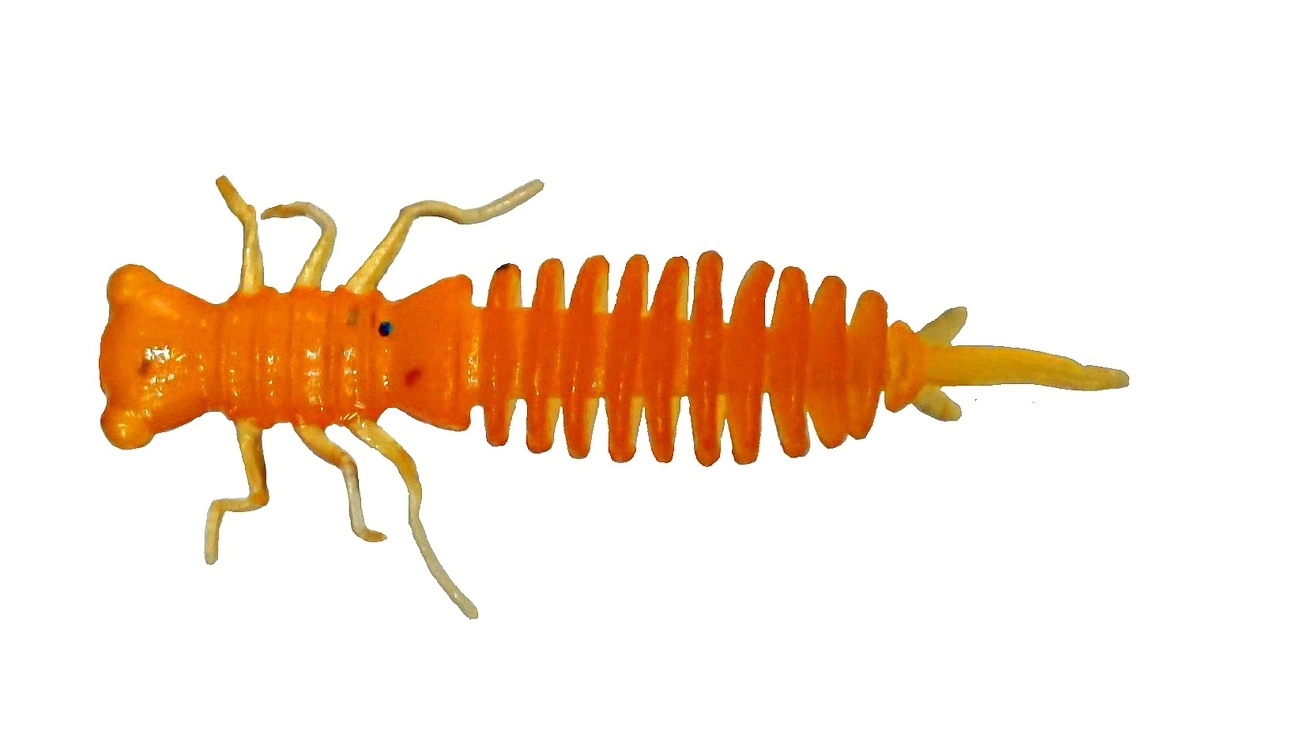 Эта имитация личинки стрекозы отменно работает круглый год. Излюбленная пища и хищных, и мирных рыб, это насекомое живет во всех водоемах, перемещается по дну и водным растениям относительно медленно, и легко становится добычей любого из подводных обитателей, кто в силах ее проглотить. Силиконовые имитации личинок стрекозы стали появляться на прилавках рыболовных магазинов лишь недавно - скопировать эту живность во всех деталях оказалось нетрудно.